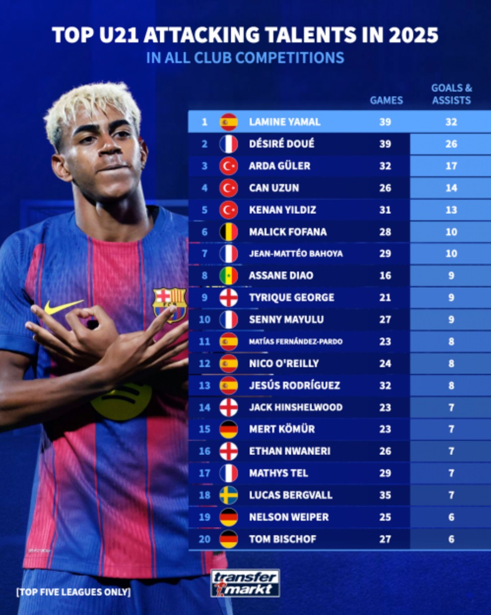 欧洲五大联赛U21球员进球新星榜单出炉,亚马尔领跑